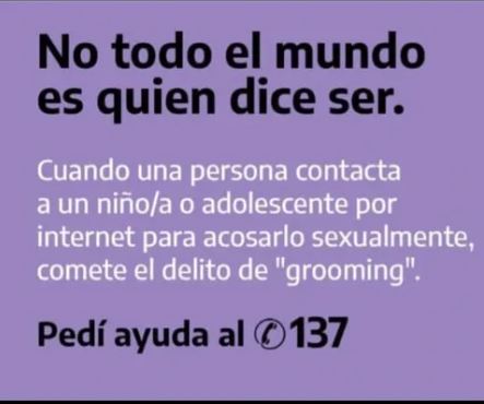 Paralelamente, se promueve una campaña de concientización bajo las consignas: “La violencia virtual o digital es delito”, “Frenemos el ciberacoso” y “No lo dejes pasar”. También se recuerda que el grooming –cuando un adulto contacta a un niño o adolescente por internet con fines sexuales– es un delito y puede denunciarse al número 137.