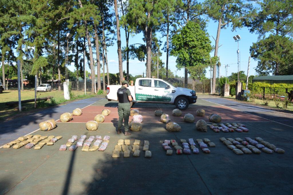 Durante el procedimiento, los gendarmes hallaron 23 bultos de gran tamaño ocultos entre la vegetación. Al inspeccionarlos, constataron que contenían 17 bultos con cogollos de marihuana y dos bultos con 116 paquetes rectangulares de una sustancia vegetal compacta, que tras las pruebas de campo dieron positivo para cannabis sativa.