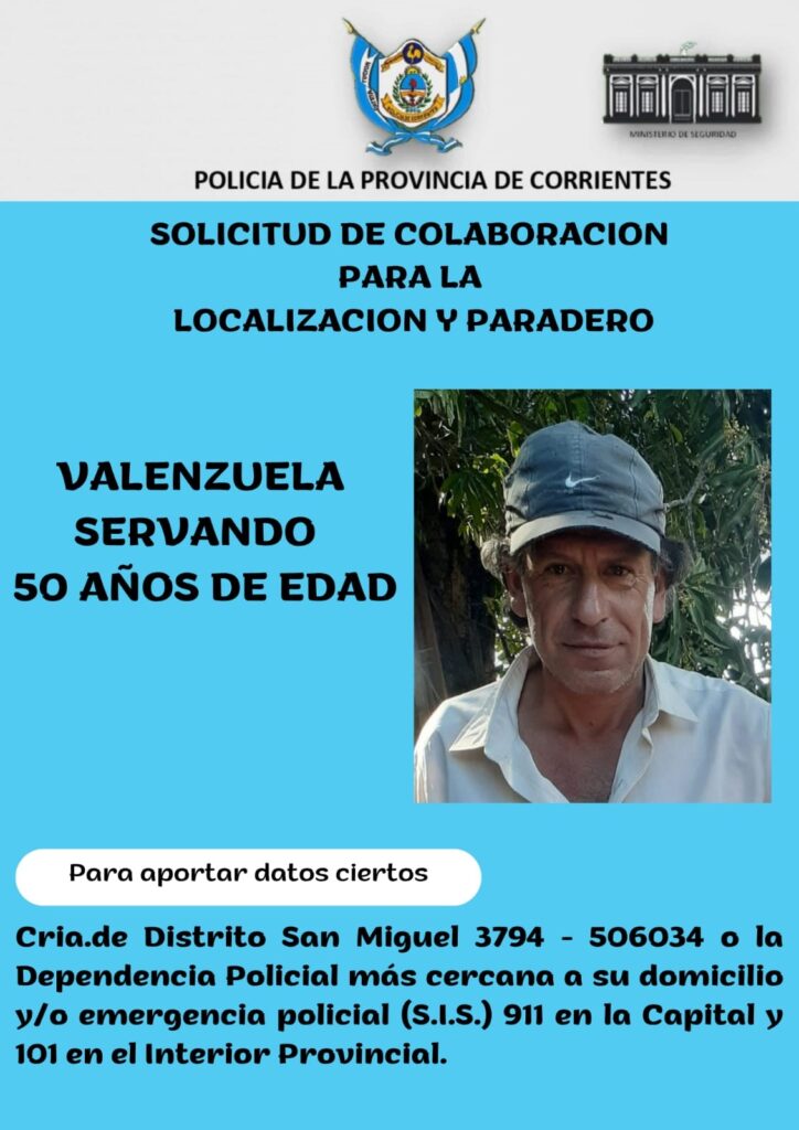 San Miguel, Corrientes, 2 de octubre 2025. – La Policía de la Provincia intensificó de manera urgente las tareas de búsqueda y localización de Servando Valenzuela, un ciudadano de 50 años de edad, cuyo paradero se desconoce.