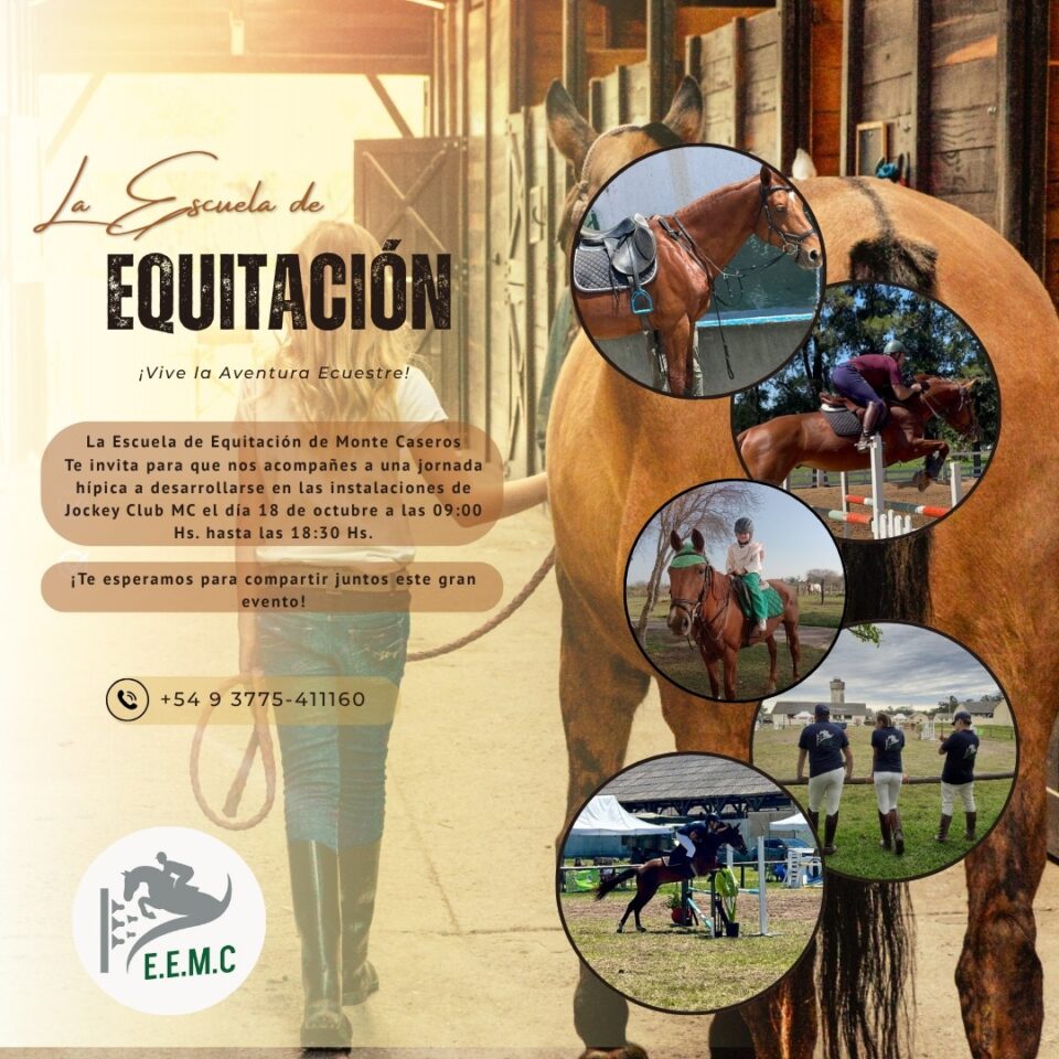 Monte Caseros, 7 de octubre 2025. – Bajo el lema «¡Vive la Aventura Ecuestre!«, la Escuela de Equitación de Monte Caseros extiende invitación a toda la comunidad para participar de una gran jornada hípica. La cita será el próximo 18 de octubre, en las instalaciones del tradicional Jockey Club Monte Caseros, desde las 09:00 hasta las 18:30 horas.