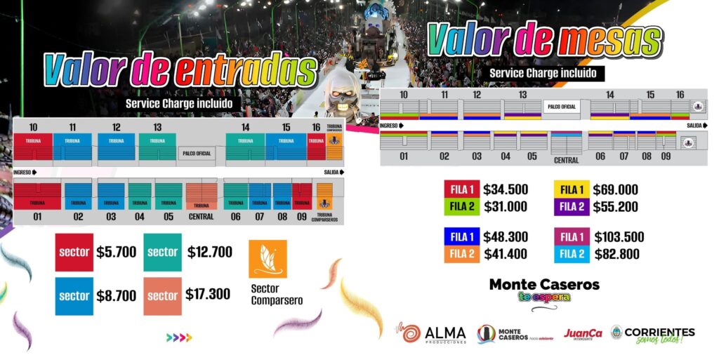 Las entradas están disponibles tanto de forma presencial como online. La boletería del Corsódromo abre de 8:00 a 12:30 y de 18:00 a 22:30 hs, mientras que la venta digital se realiza a través de www.puertavip.com, sin límite de compra por persona. Los menores de 5 años acceden gratis.