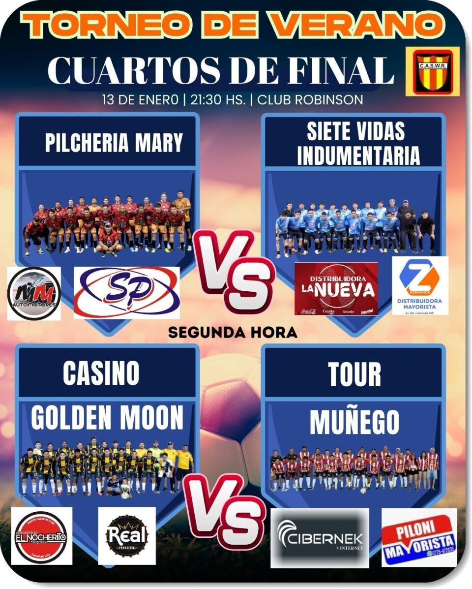 Con el nombre de Eduardo «Falu» Giménez, el Club Atlético Samuel W. Robinson albergará este noche 13 de enero, a partir de las 21:30 horas, una noche cargada de pasión futbolística. Allí se disputarán los partidos correspondientes a los Cuartos de Final del Torneo de Verano, definiendo a los equipos que avanzarán a la semifinal.