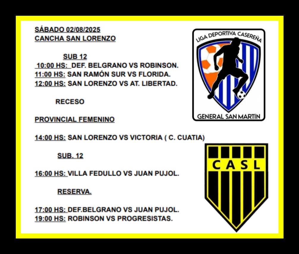 La jornada comenzará en la Cancha San Lorenzo con los partidos de la categoría Sub 12: a las 10:00 hs, Def. Belgrano vs. Robinson; a las 11:00 hs, San Ramón Sur vs. Florida; y a las 12:00 hs, San Lorenzo vs. At. Libertad. Tras un receso, a las 14:00 hs se jugará el encuentro del Provincial Femenino entre San Lorenzo y Victoria (C. Cuatia). Por la tarde, continuará la Sub 12 con Villa Fedullo vs. Juan Pujol a las 16:00 hs, seguido por los partidos de Reserva: Def. Belgrano vs. Juan Pujol a las 17:00 hs y Robinson vs. Progresistas a las 19:00 hs.