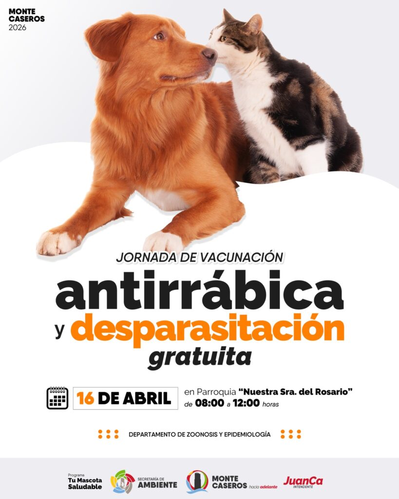 En el marco del programa “Tu Mascota Saludable”, el Departamento de Zoonosis y Epidemiología pondrá en marcha una nueva campaña de vacunación antirrábica y desparasitación gratuita para perros y gatos. La jornada se llevará a cabo el próximo jueves 16 de abril, en las instalaciones de la Parroquia Nuestra Señora del Rosario, en el horario de 08:00 a 12:00 horas.