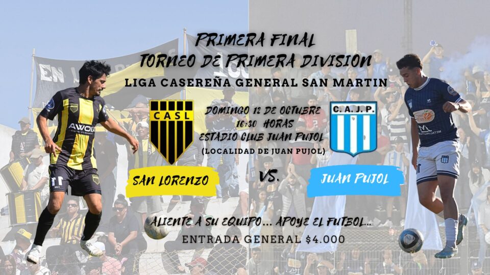 Monte Caseros, 6 de octubre de 2025.- En la reunión ordinaria de la Liga se definió como será los partidos de la final de primera división. Este domingo 12 de octubre, a las 16:30 horas, el Estadio Que Juan Pujol de la localidad homónima será el escenario de la primera final del Torneo de Primera División de la Liga Caserena General San Martín, con el enfrentamiento entre Club Atlético San Lorenzo y el Club Atlético Juan Pujol.