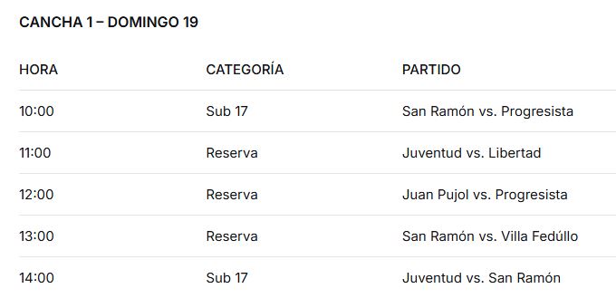 En la Cancha 1, el plato fuerte estará en la Reserva, con tres encuentros consecutivos desde las 11:00, destacándose el cruce entre Juventud y Libertad, y más tarde San Ramón vs. Villa Fedúllo. Por la tarde, a las 14:00, el Sub 17 cerrará con el duelo entre Juventud y San Ramón.