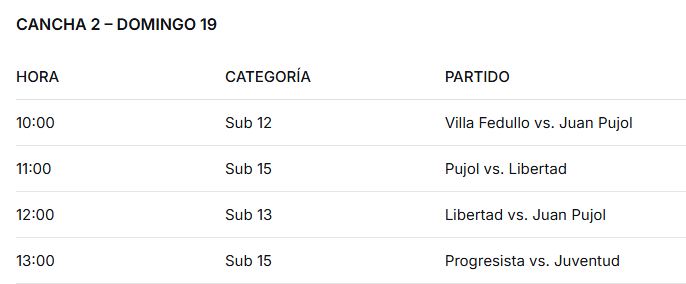 Por su parte, en la Cancha 2, la atención estará puesta en las divisiones menores. Desde las 10:00, el Sub 12 abrirá la jornada con el encuentro entre Villa Fedullo y Juan Pujol. Más tarde, a las 13:00, el Sub 15 promete emociones fuertes con el cruce entre Progresista y Juventud.