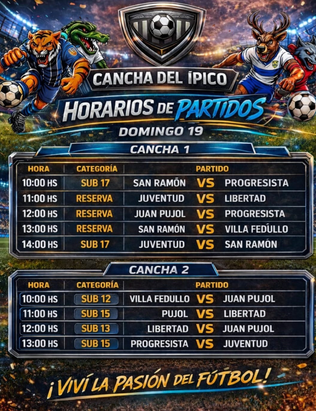 Este domingo 19, las Canchas del Club Hípico serán el escenario de una nueva y apasionante fecha del Torneo Preparación 2026, certamen organizado por los clubes Juventud, Libertad, Progresista, San Ramón, Villa Fedúllo y Juan Pujol. La actividad comenzará a las 10 de la mañana y se extenderá durante toda la jornada, con partidos en las categorías Sub 12, Sub 13, Sub 15, Sub 17 y Reserva.
