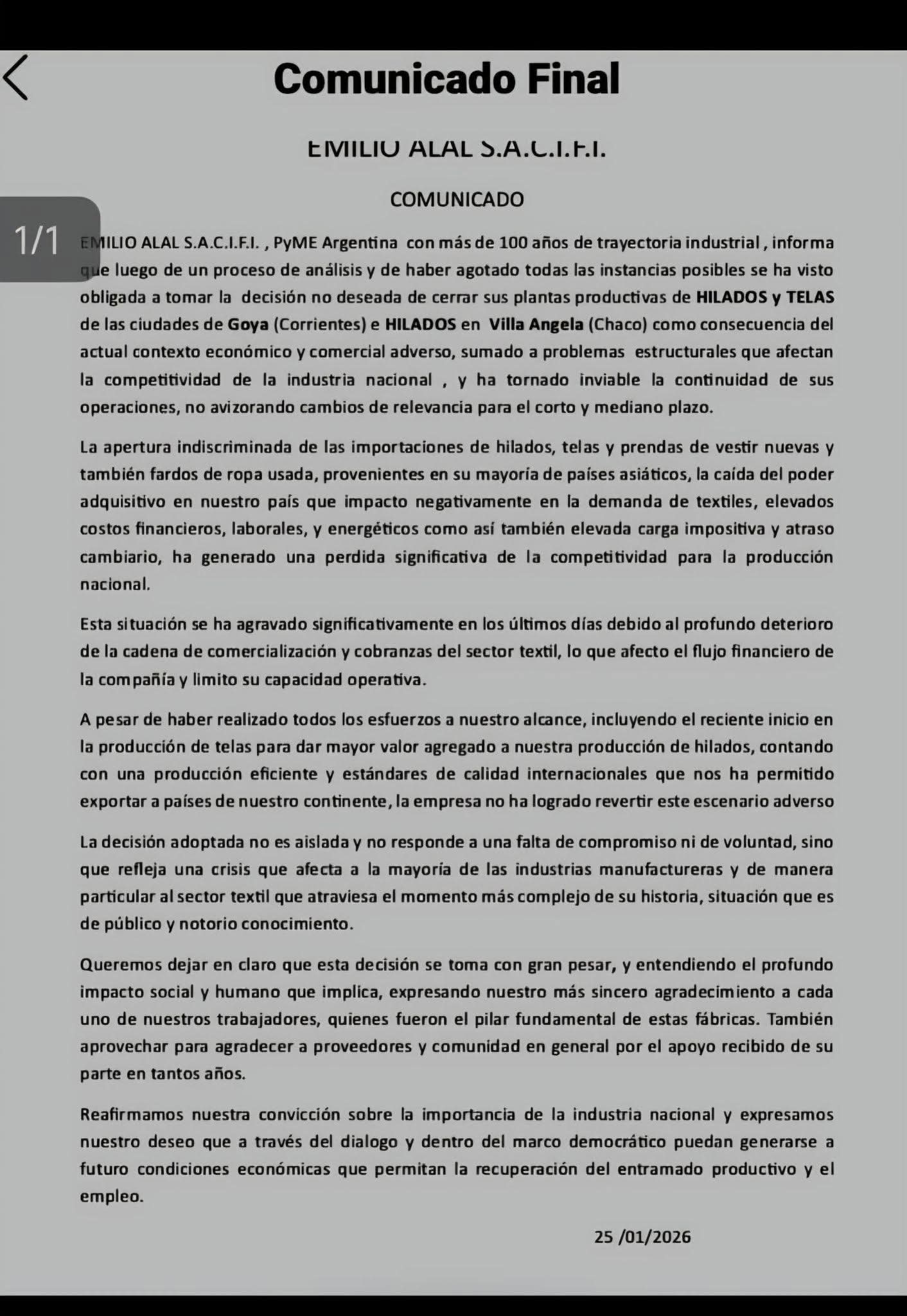 En un golpe duro para la industria textil regional, la empresa centenaria Emilio Alal S.A.C.I.F.I. confirmó el cierre definitivo de sus plantas productivas en Goya, Corrientes, y Villa Ángela, Chaco, dejando sin empleo directo a más de 260 trabajadores.