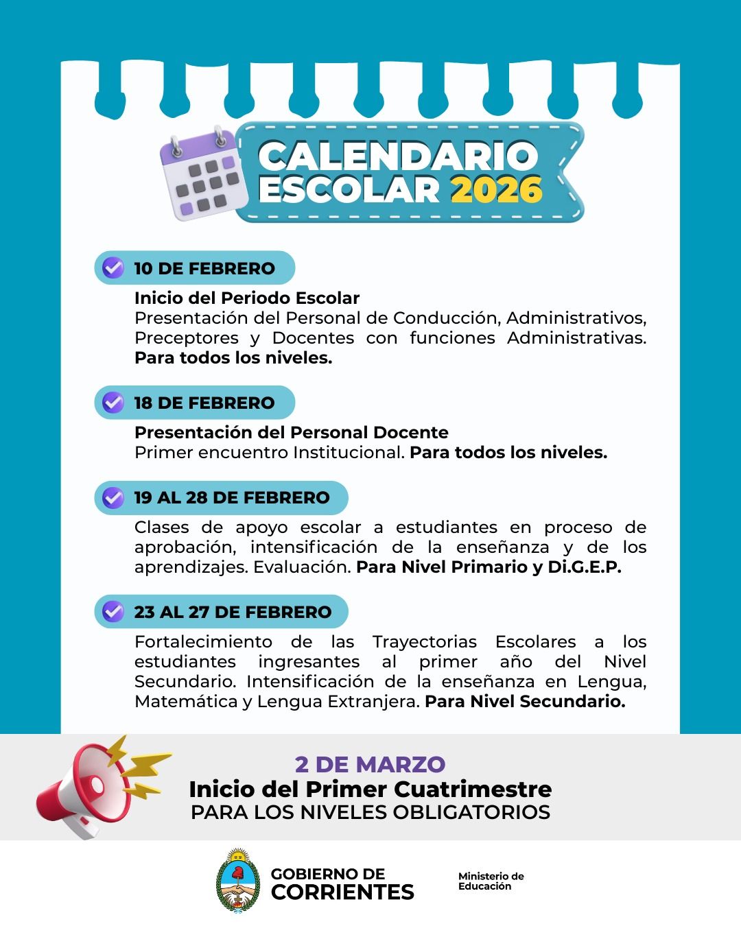 En paralelo, desde el miércoles 19 y hasta el viernes 28 de febrero, se desarrollará una etapa clave para el Nivel Primario y la Di.G.E.P.: las clases de apoyo escolar. Este período está destinado específicamente a estudiantes en proceso de aprobación, con el objetivo de intensificar la enseñanza, consolidar aprendizajes y realizar evaluaciones que permitan su promoción.