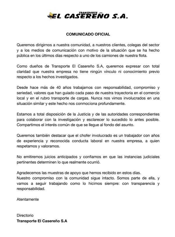 La empresa, con más de 40 años de trayectoria en el transporte de cargas, se mostró «conmocionada» por la situación y se puso a disposición de la Justicia para colaborar en la investigación. «Estamos a total disposición de la Justicia y de las autoridades correspondientes para colaborar con la investigación y esclarecer lo sucedido lo antes posible«, afirmaron.