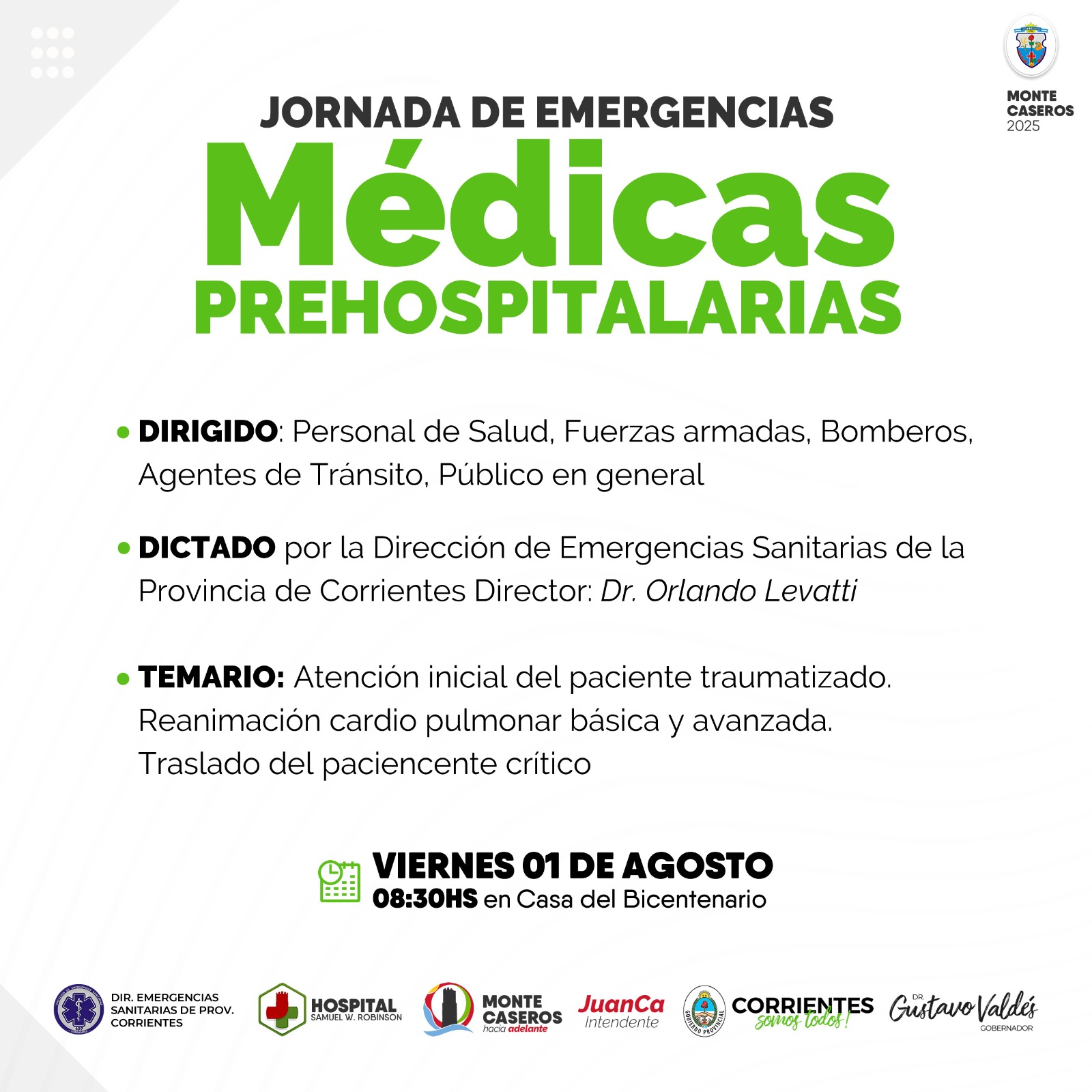El mismo día, a las 08:30 hs, en la Casa del Bicentenario, se dictará una capacitación en emergencias médicas dirigida a personal de salud, fuerzas armadas, bomberos, agentes de tránsito y público en general. El temario incluirá:
