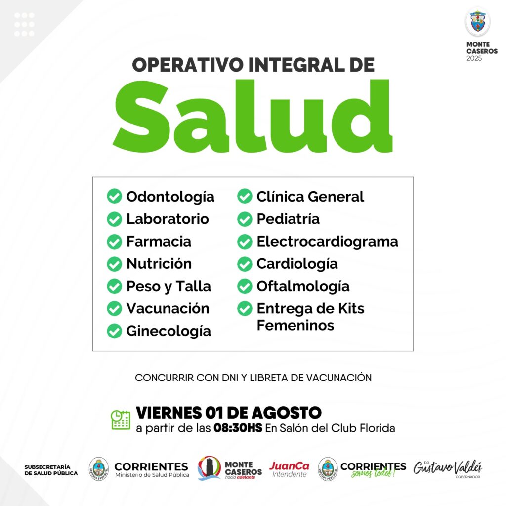El Ministerio de Salud Pública de Corrientes organiza una serie de actividades gratuitas para la comunidad, incluyendo un operativo integral de salud, una jornada de capacitación en emergencias médicas y una campaña de vacunación. Los servicios estarán disponibles el 31 de julio y 1 de agosto en distintos puntos de Monte Caseros, con atención médica, asesoramiento y vacunas sin costo.