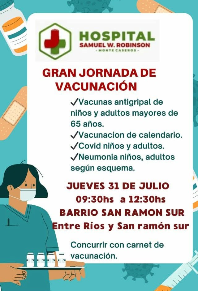 Previo a estas actividades, el jueves 31 de julio, de 09:30 a 12:30 hs, el Hospital Samuel W. Robinson realizará una jornada de vacunación en el Barrio San Ramón Sur (Entre Ríos y San Ramón Sur). Se aplicarán: