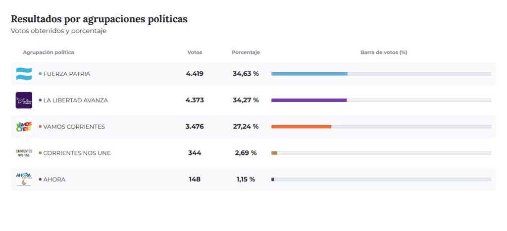 Fuerza Patria se impuso con un ajustado 34.63% delante de La Libertad Avanza (34.27%), en un circuito que se definió por menos de medio punto porcentual. Vamos Corrientes relegado al tercer lugar.