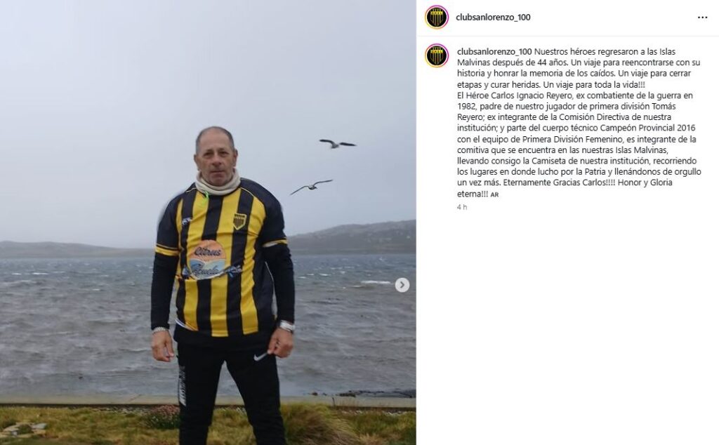 Ex combatiente de Malvinas, padre de un jugador de San Lorenzo y ex dirigente del club, recorrió las Islas después de 44 años con la camiseta azulgrana. La institución lo destacó en sus redes con orgullo y respeto: «Eternamente gracias Carlos. Honor y gloria eterna«.